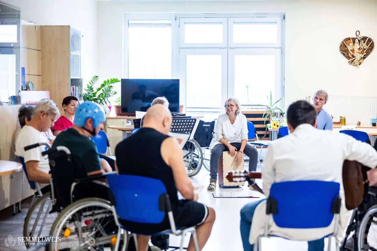 Heti rendszerességgel tartanak közösségi zeneterápiát stroke-ból vagy más súlyos agysérülésből felépülő betegeknek a Rehabilitációs Klinikán. A foglalkozásokon főként afáziával küzdők vesznek részt, akiknél a beszédképesség sérült, és akik számára a zene nemcsak élményt, hanem kapaszkodót is jelent.